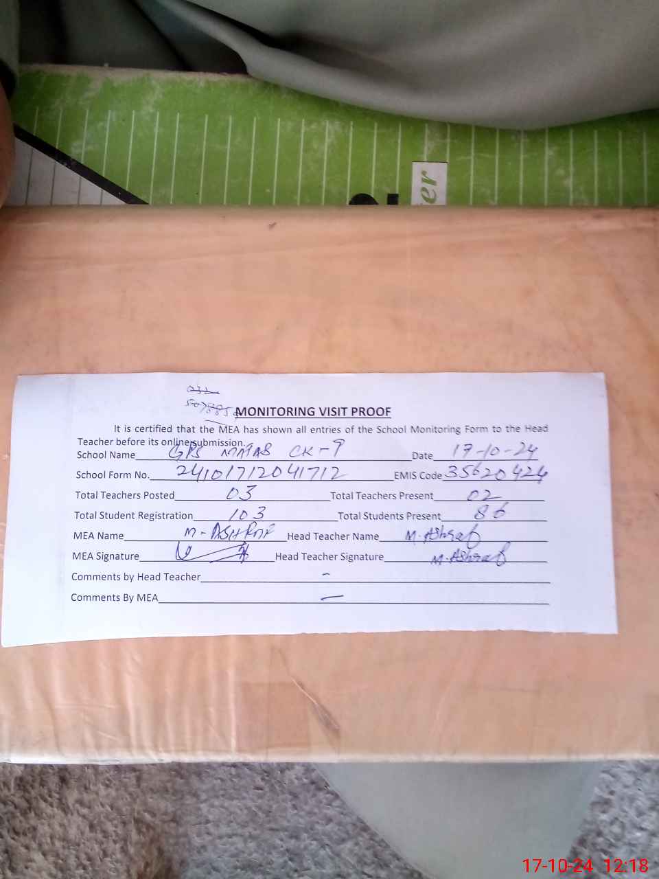 | Attendance Register | Head Teacher | MEA with School | Visit Proof |