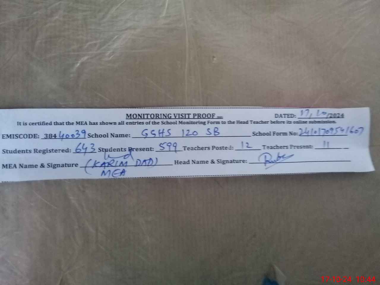 | EMIS Code: 38440039 | Name of School: GGHS CHAK NO.120 SB | |||