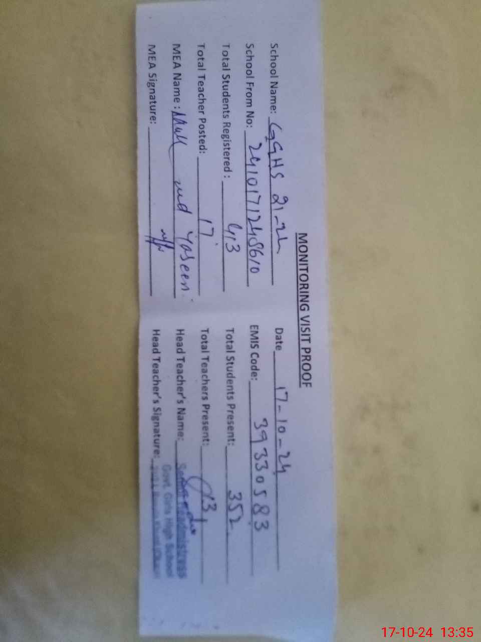 | Attendance Register | Head Teacher | MEA with School | Visit Proof |