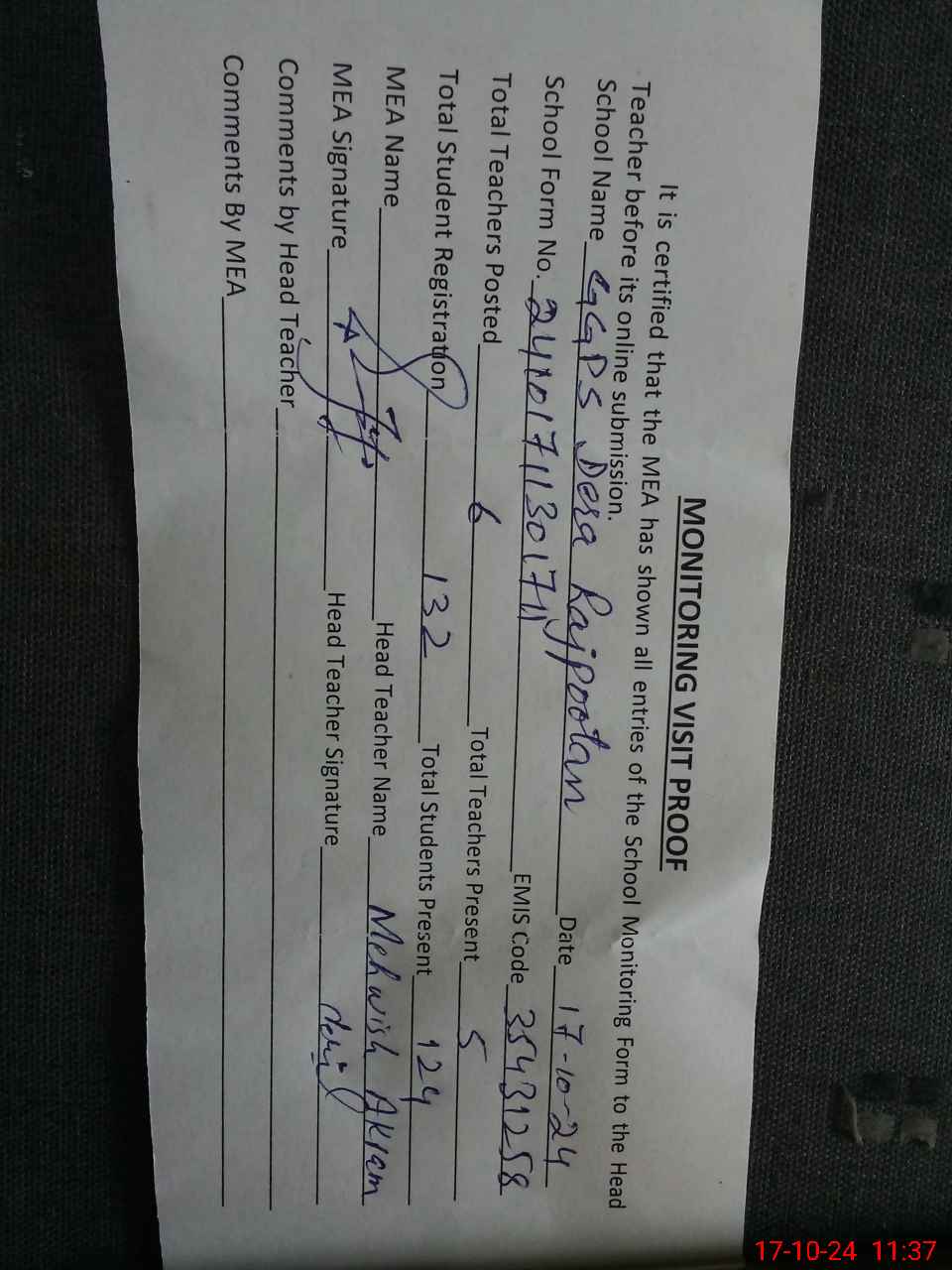 | Attendance Register | Head Teacher | MEA with School | Visit Proof |