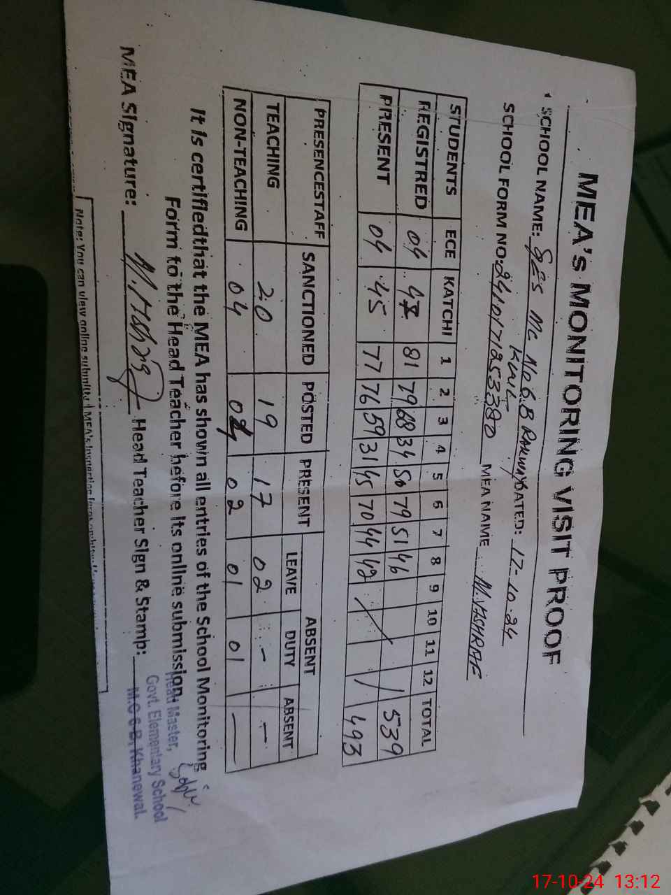 | Attendance Register | Head Teacher | MEA with School | Visit Proof |