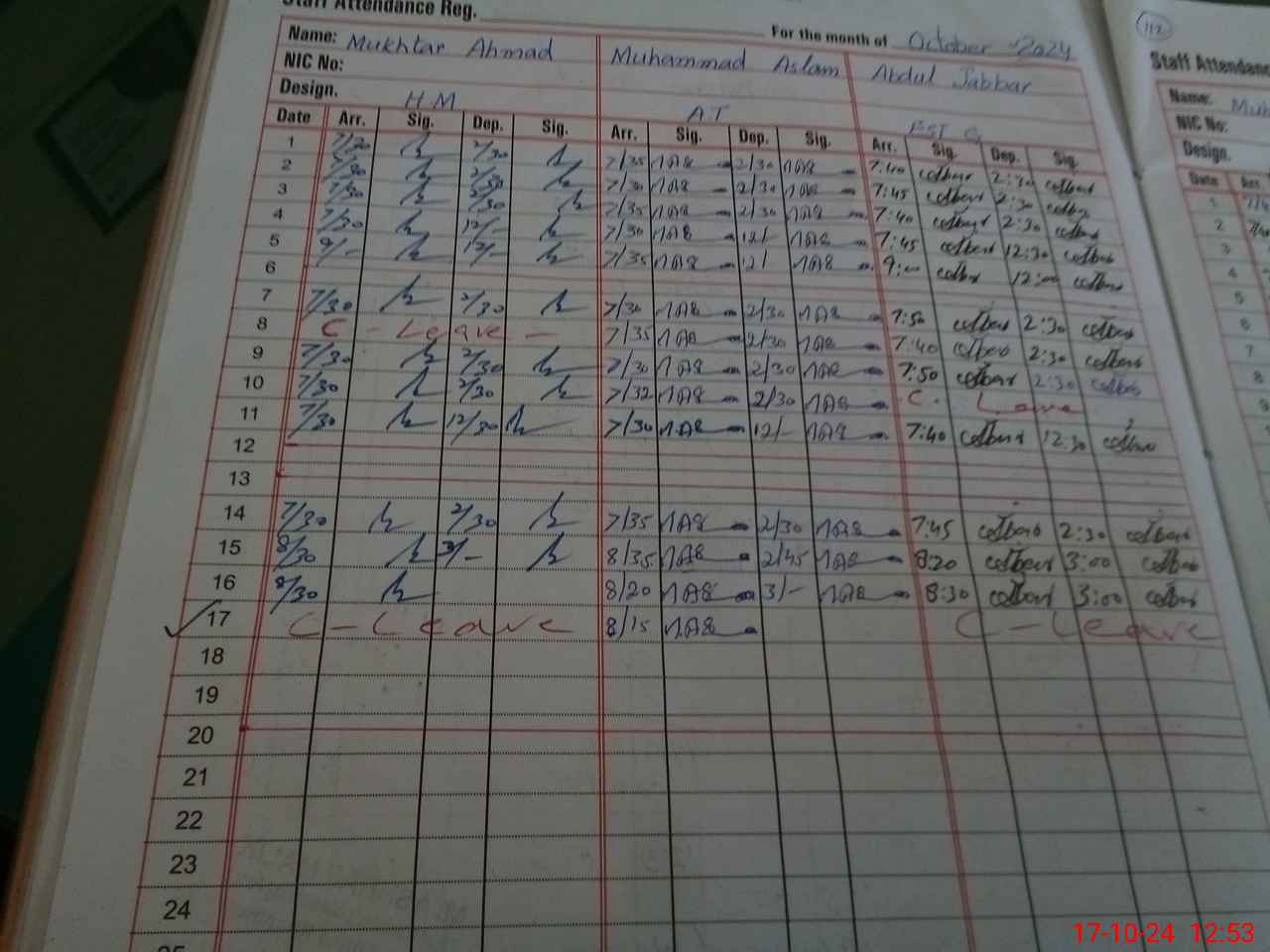 | CNIC | Full Name | Designation | R/C | Absence during last cal. month |