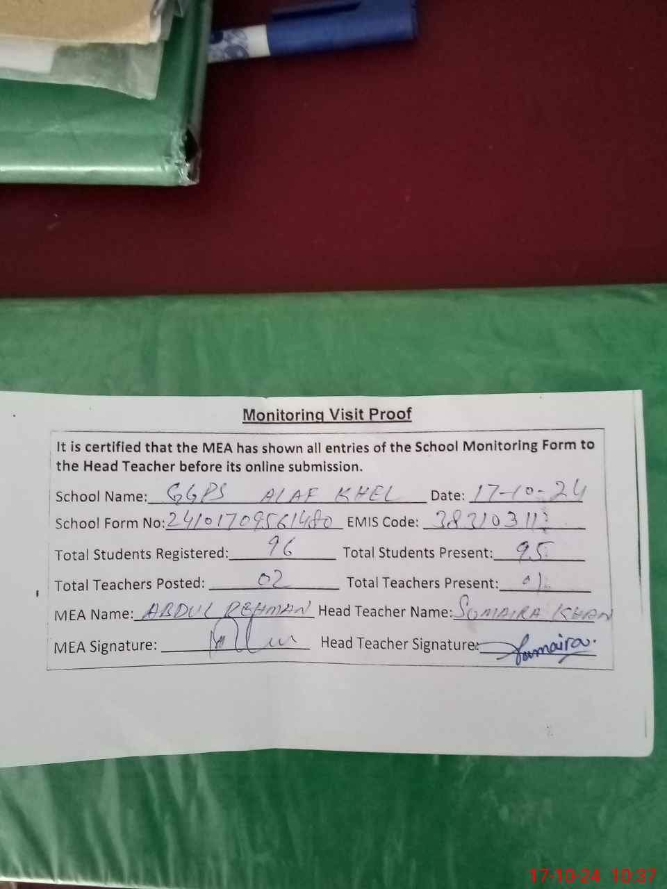 | EMIS Code: 38310311 | Name of School: GGPS ALAF KHEL | |||