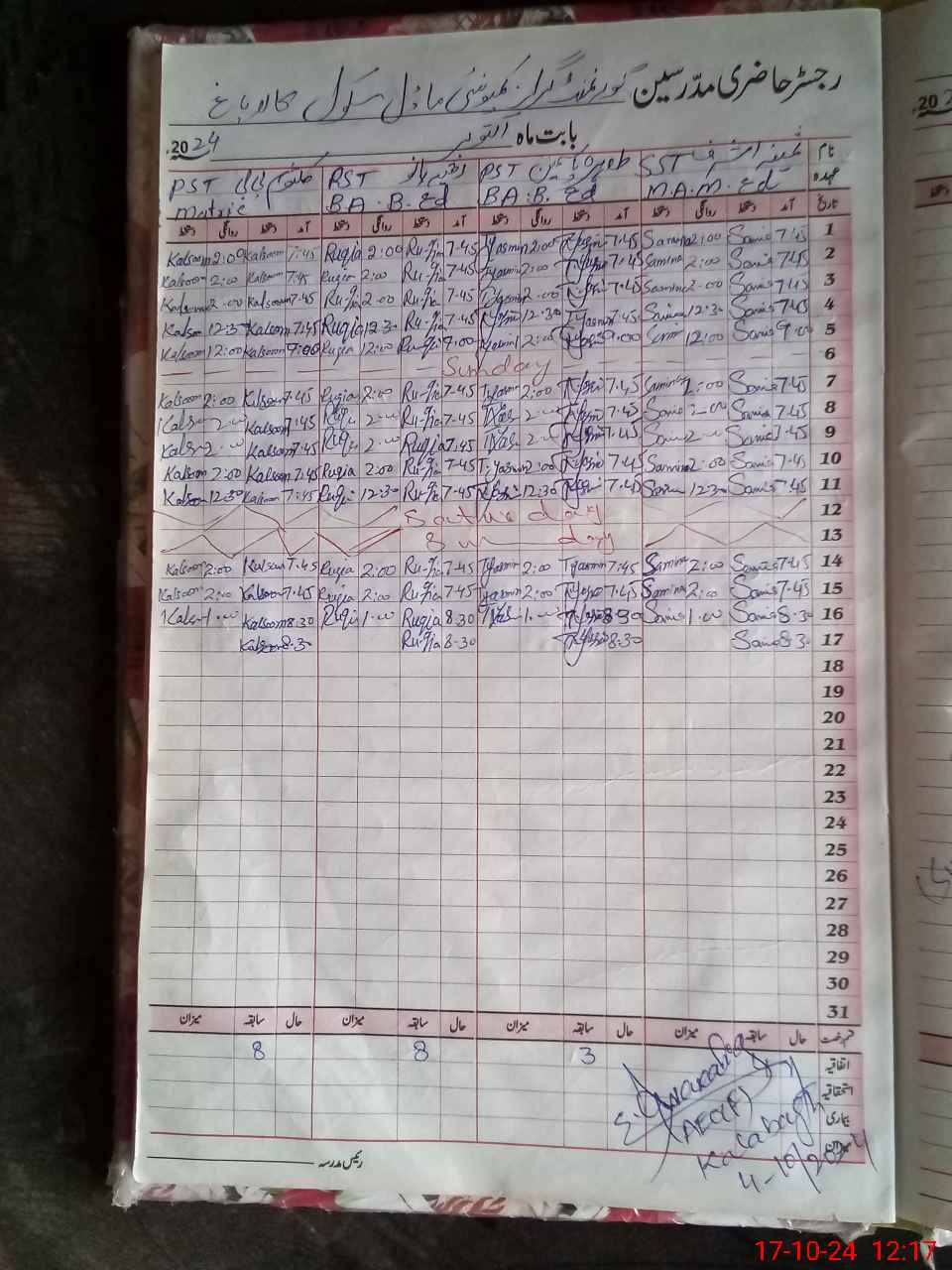 | Total no. of Classrooms: 10 No. of Classrooms Used for Teaching: 8 No. of Classrooms Storing Old Furniture, FTBs, etc: 0Comments if Any: PST Bi Bi Marjana CNIC No 3830148928296 is present and newly transferred from GGPS Kacha Bangi Khel since 5 October 2024 but her name does not exist in SIS as well as MEA Tab |