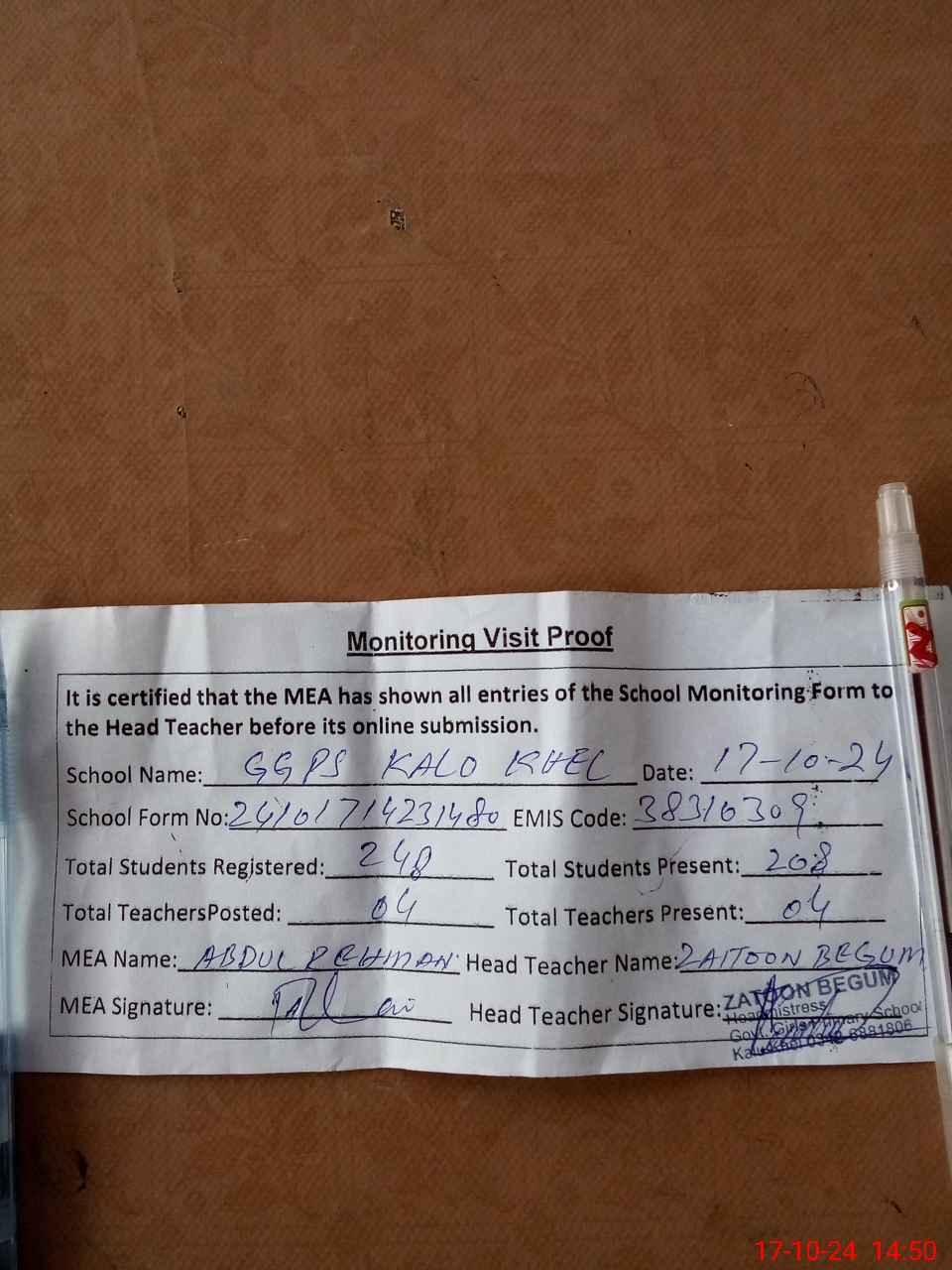 | Attendance Register | Head Teacher | MEA with School | Visit Proof |