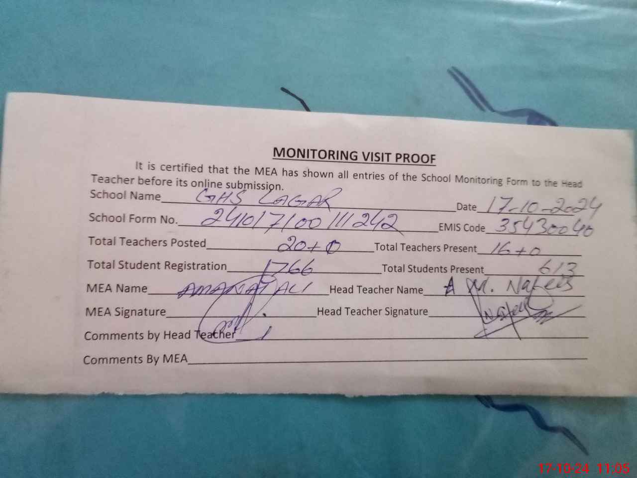 | Attendance Register | Head Teacher | MEA with School | Visit Proof |