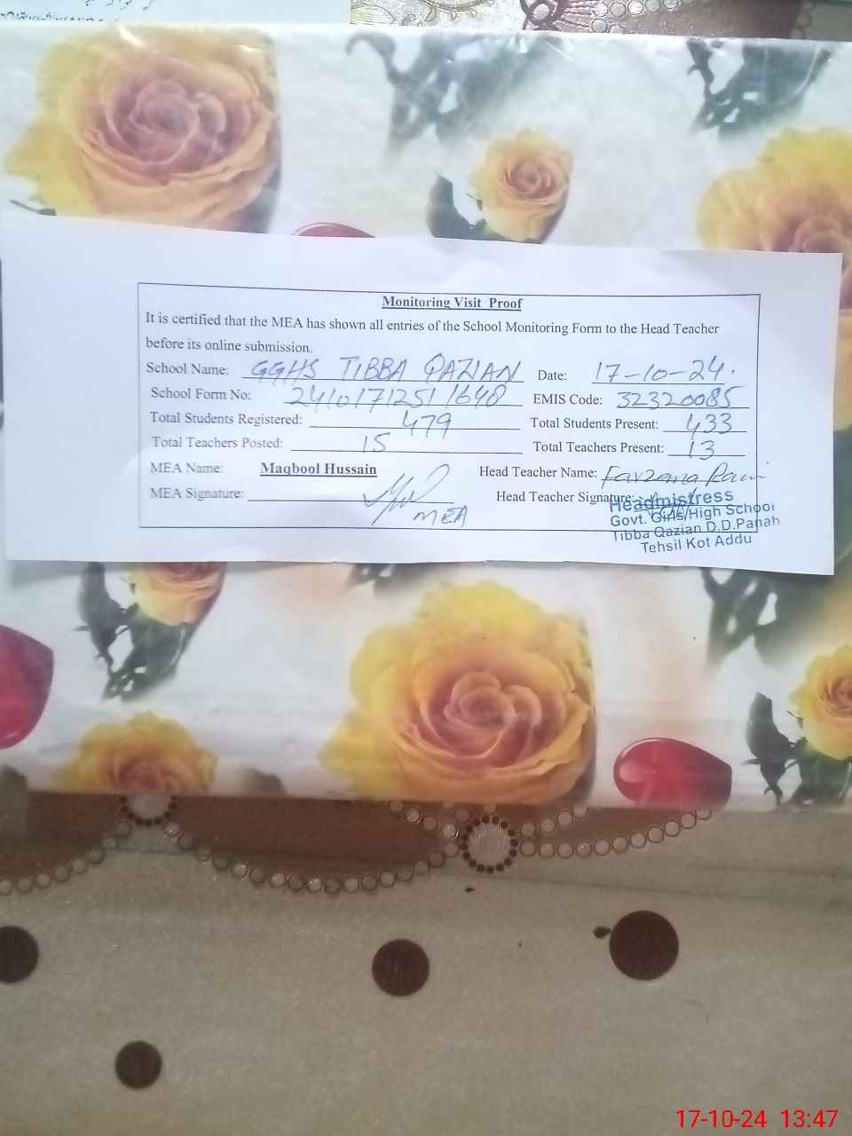 | Certified that this School was Inspected by the Undersigned MEA/DMO Today and the Information Stated Above is as Per Record. | |||||