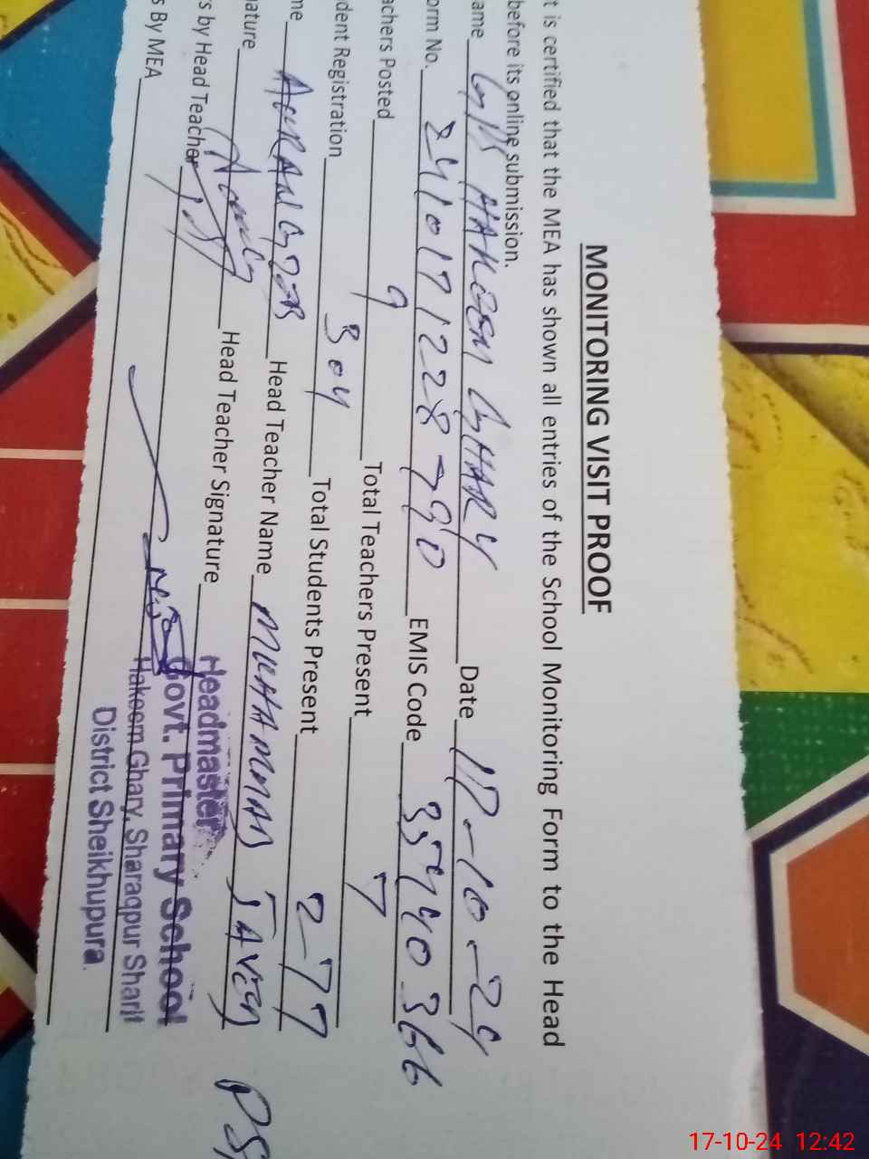 | Attendance Register | Head Teacher | MEA with School | Visit Proof |