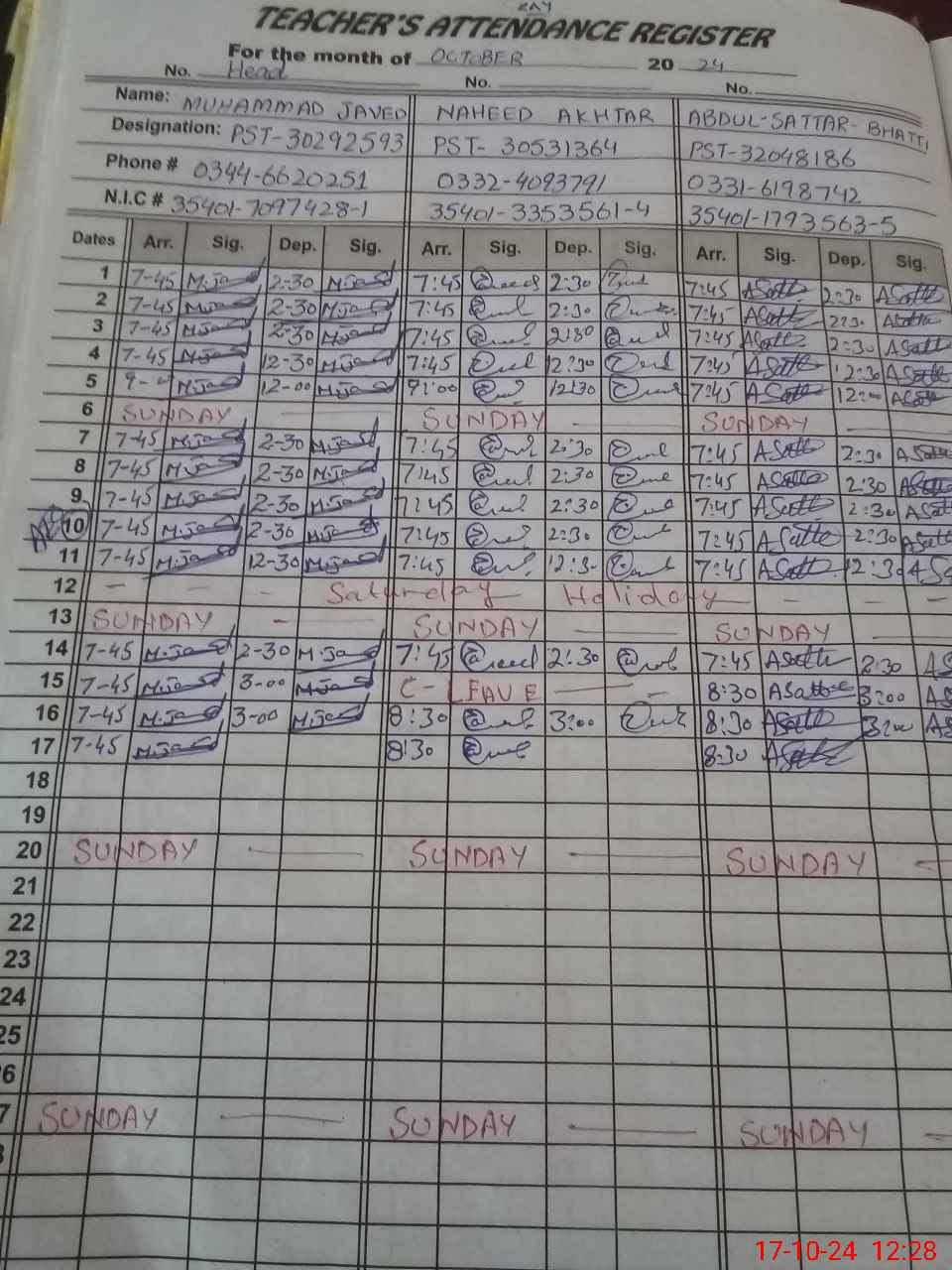 | CNIC | Full Name | Designation | R/C | Absence during last cal. month |