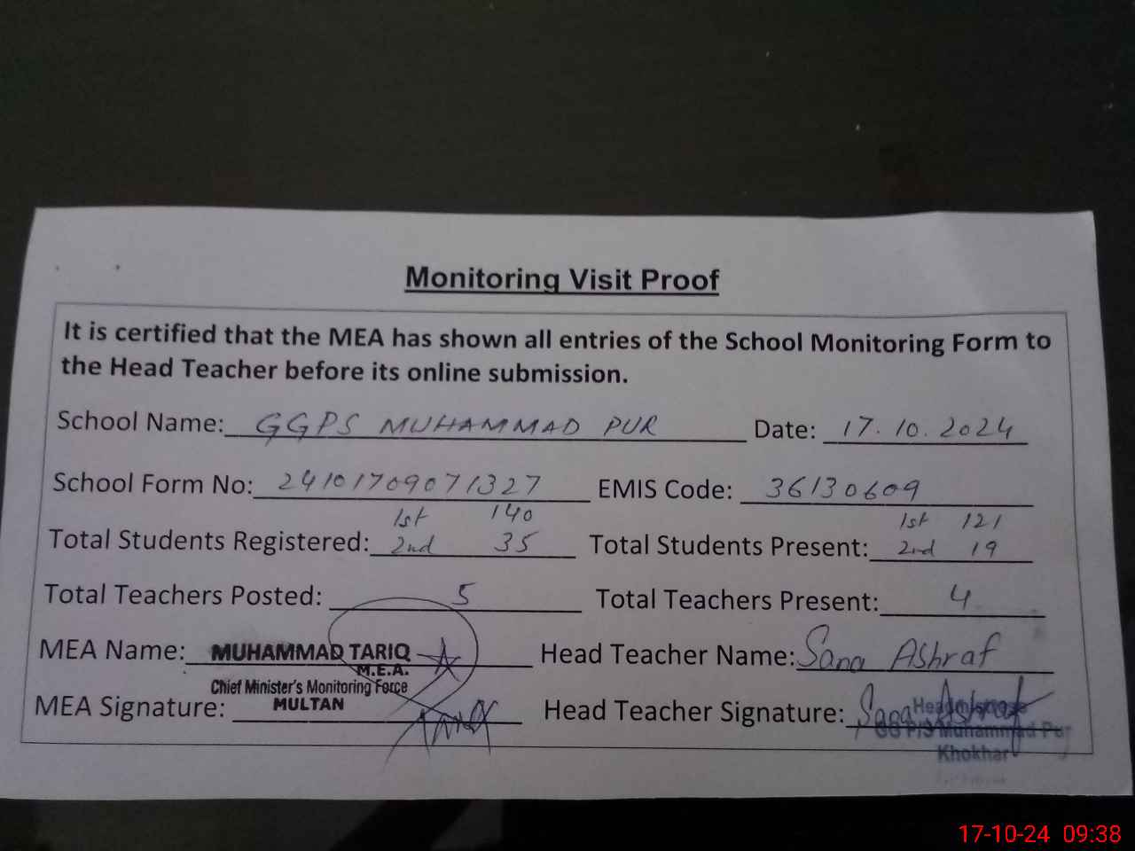 | EMIS Code: 36130609 | Name of School: GGPS MUHAMMAD PUR KHOKHAR | |||