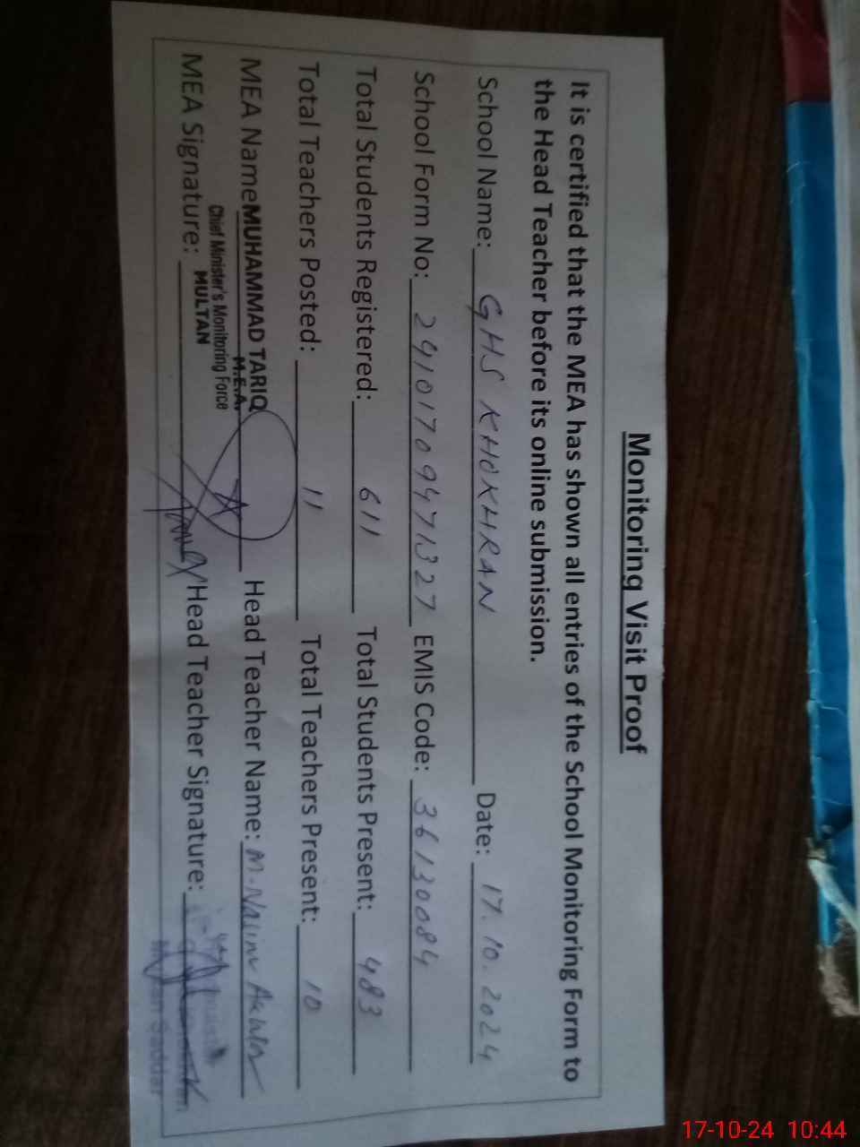 | Certified that this School was Inspected by the Undersigned MEA/DMO Today and the Information Stated Above is as Per Record. | |||||