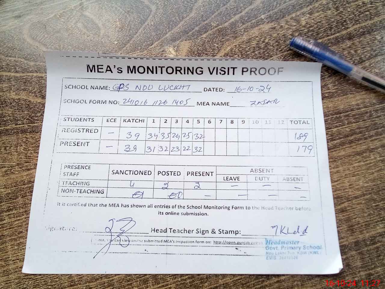 | Attendance Register | Head Teacher | MEA with School | Visit Proof |