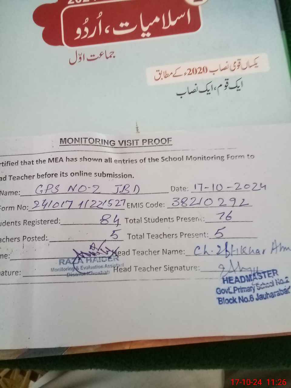 | EMIS Code: 38210292 | Name of School: GPS NO. 2 JAUHARABAD | |||