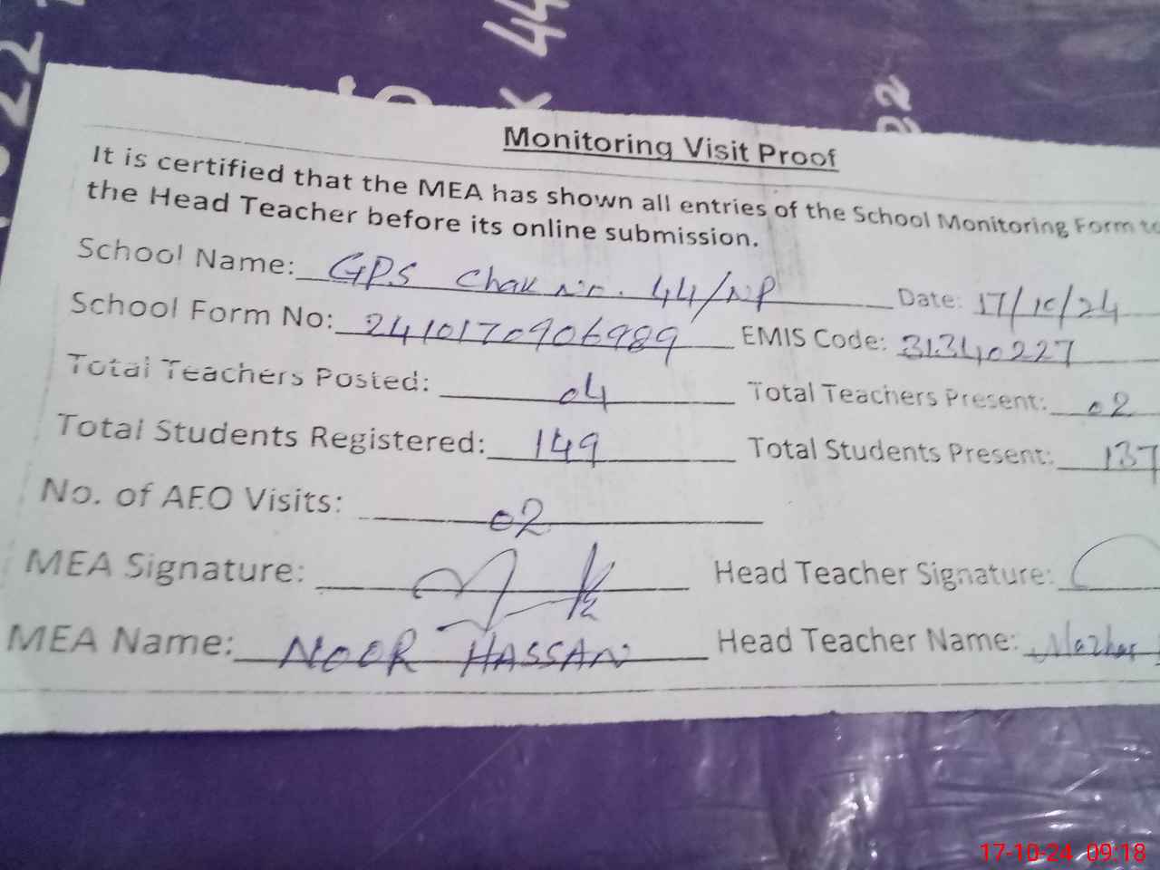| EMIS Code: 31340227 | Name of School: GPS CHAK NO. 44 NP | |||