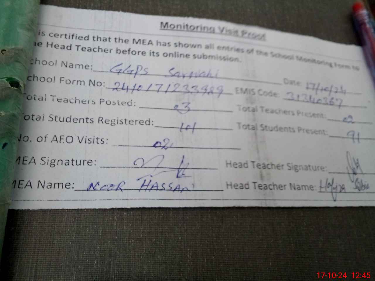 | Attendance Register | Head Teacher | MEA with School | Visit Proof |