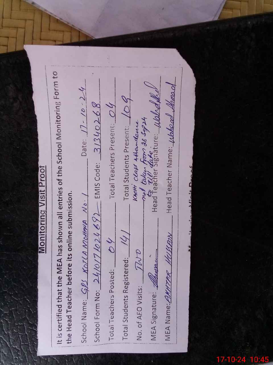 | Attendance Register | Head Teacher | MEA with School | Visit Proof |