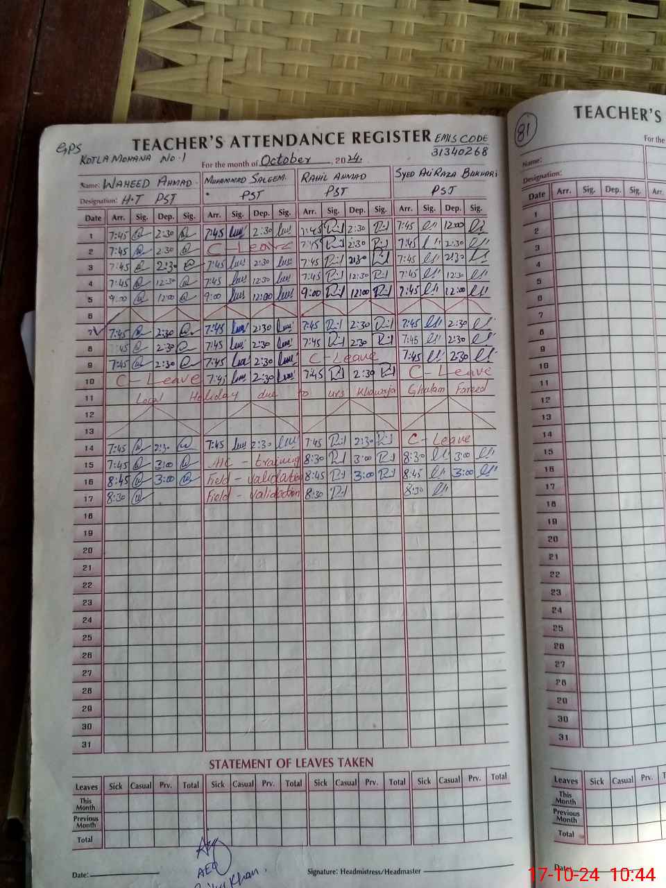 | Name: Wa**** Ah**** Designation: (School Headmaster's/Headmistress's) PST Phone/Cell Number: 03**** |
