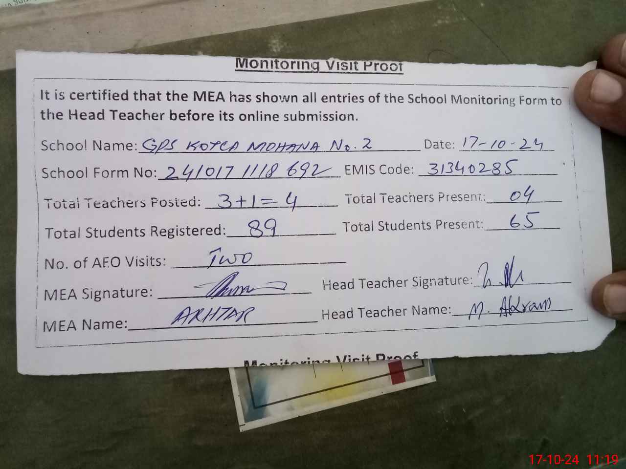 | Attendance Register | Head Teacher | MEA with School | Visit Proof |
