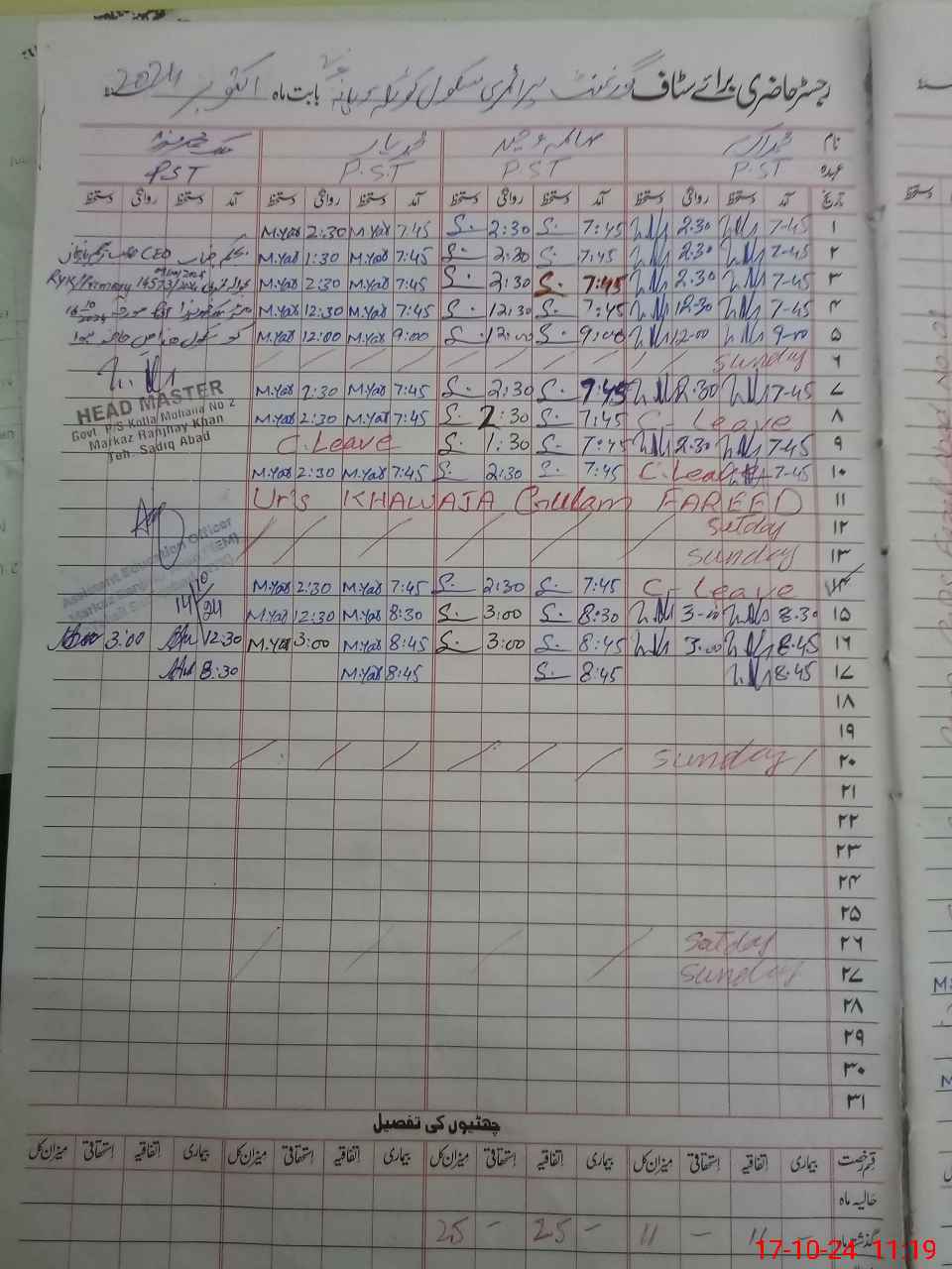 | CNIC | Full Name | Designation | R/C | Absence During Last Calender Month |