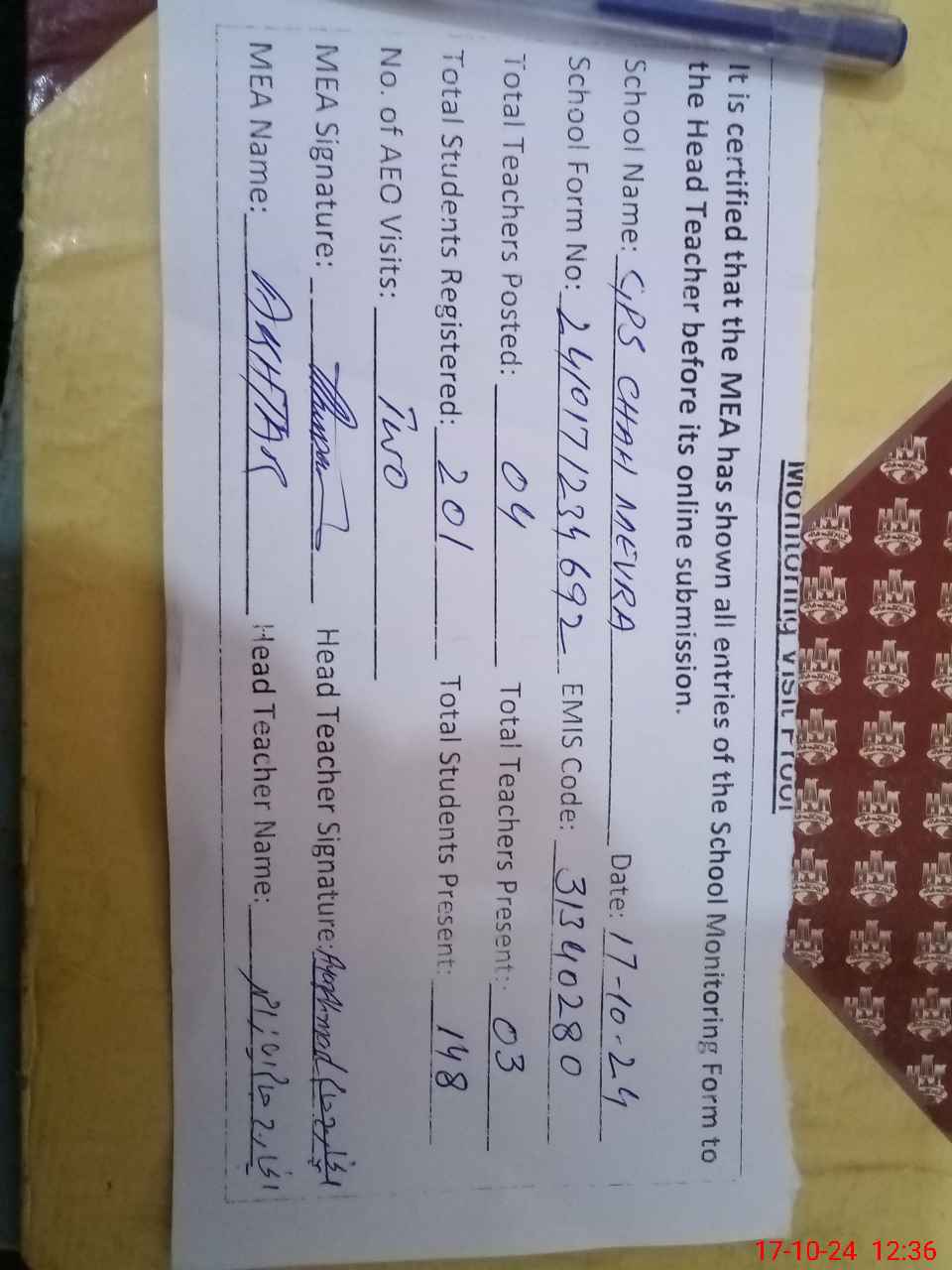 | Attendance Register | Head Teacher | MEA with School | Visit Proof |