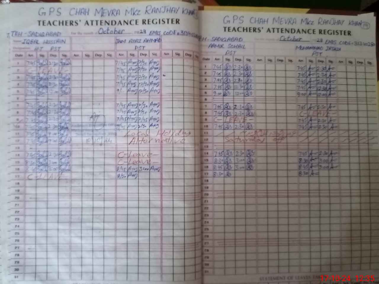| CNIC | Full Name | Designation | R/C | Absence during last cal. month |