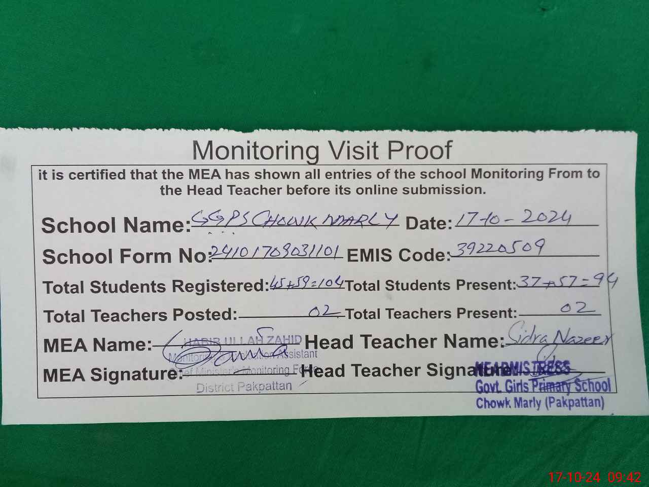 | EMIS Code: 39220509 | Name of School: GGPS CHOWK MARLAY | |||