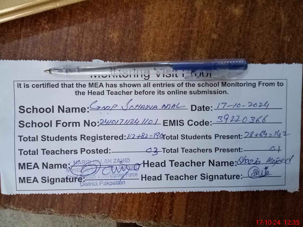 | Certified that this School was Inspected by the Undersigned MEA/DMO Today and the Information Stated Above is as Per Record. | |||||