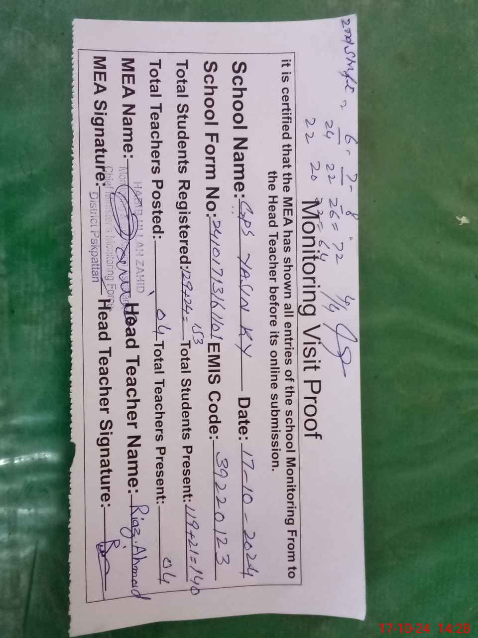 | EMIS Code: 39220123 | Name of School: GPS CHAK YASIN KAY | |||
