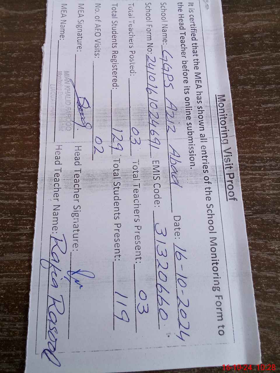 | Attendance Register | Head Teacher | MEA with School | Visit Proof |