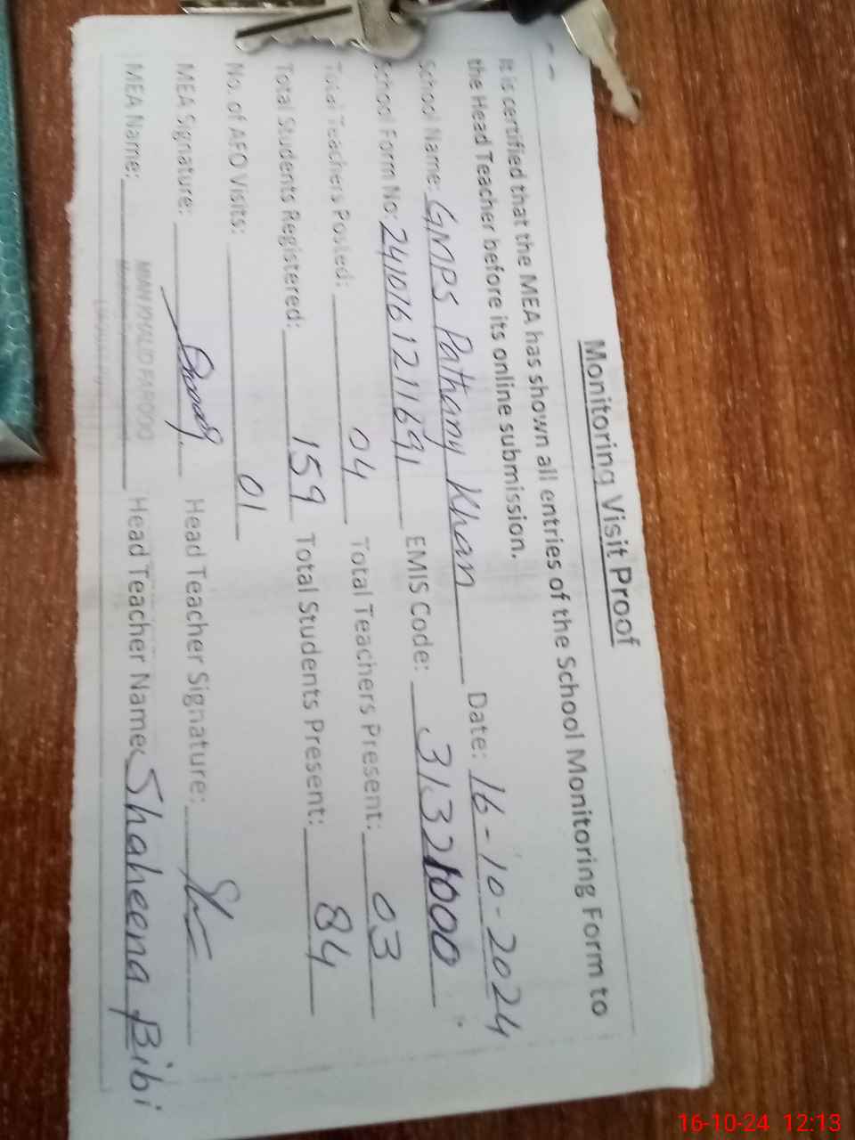 | Attendance Register | Head Teacher | MEA with School | Visit Proof |