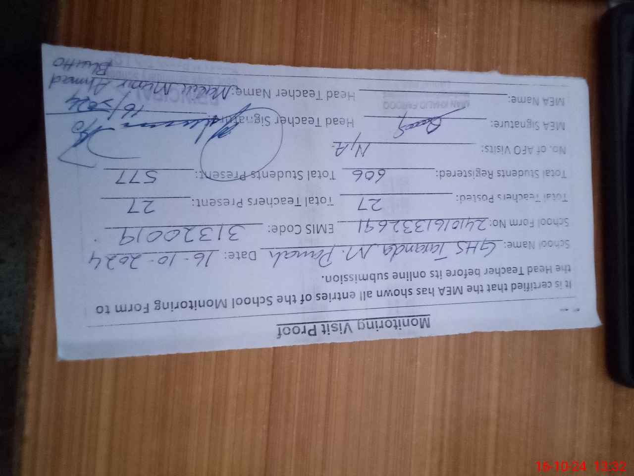| Attendance Register | Head Teacher | MEA with School | Visit Proof |