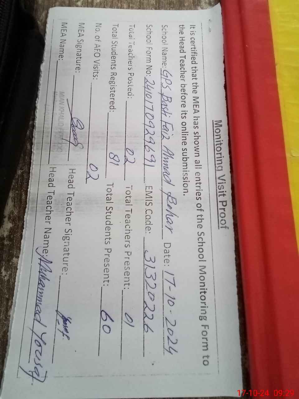| Attendance Register | Head Teacher | MEA with School | Visit Proof |