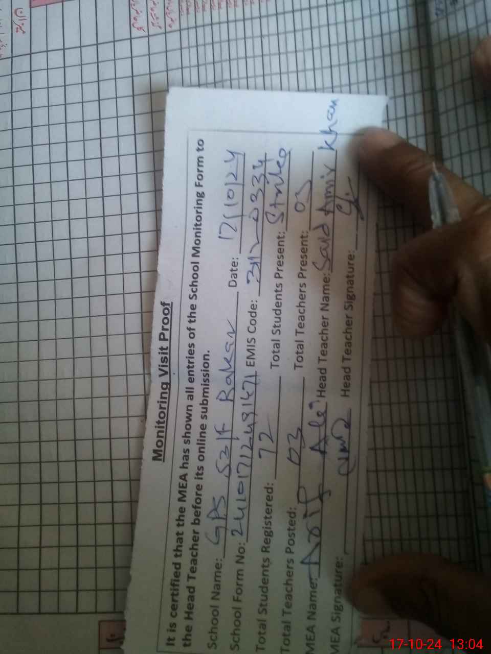 | Attendance Register | Head Teacher | MEA with School | Visit Proof |
