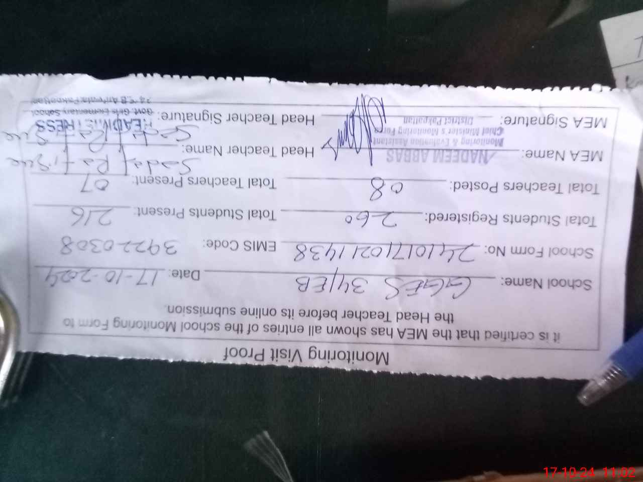 | Attendance Register | Head Teacher | MEA with School | Visit Proof |