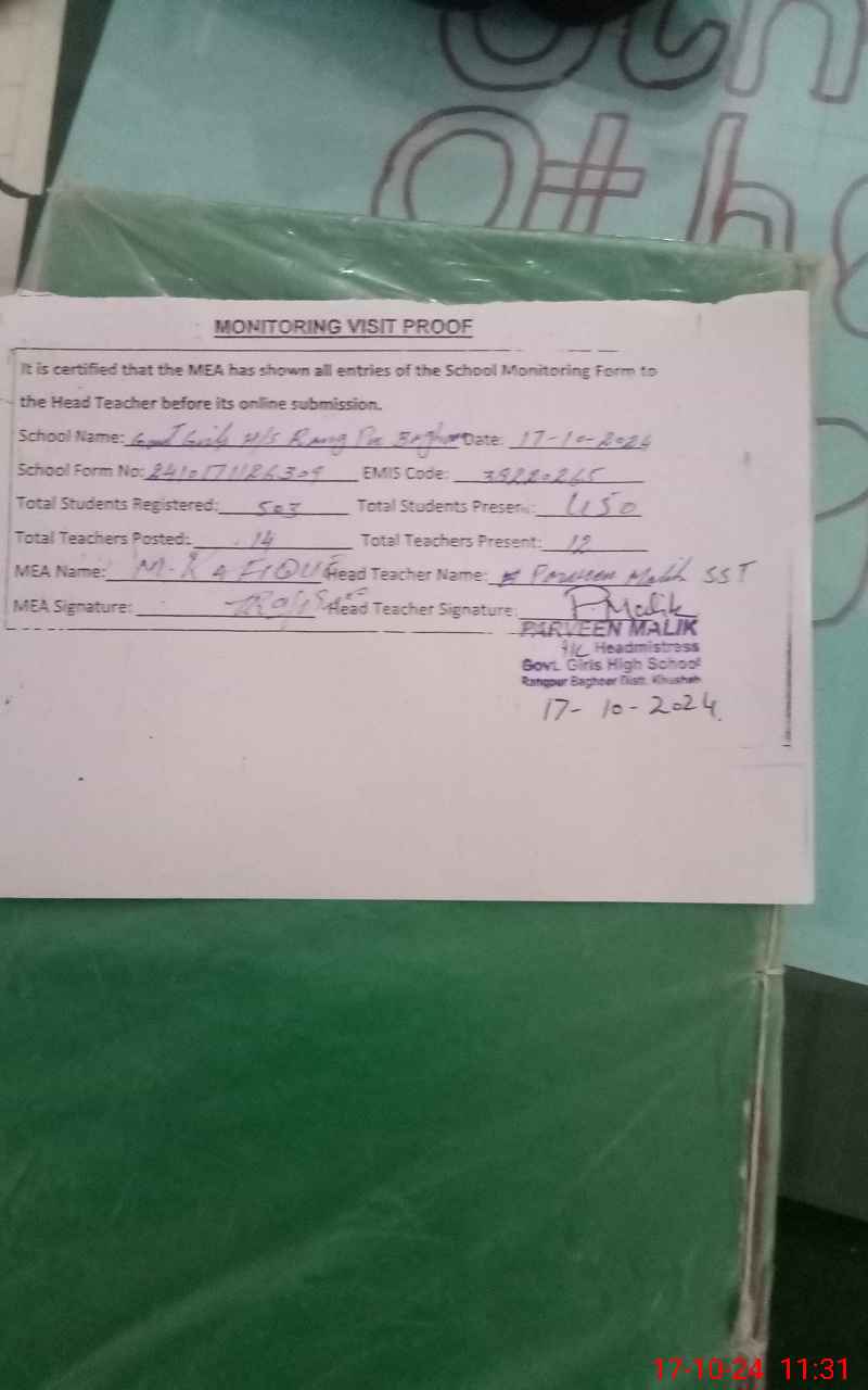 | EMIS Code: 38220265 | Name of School: GGHS RANG PUR BAGHOOR | |||