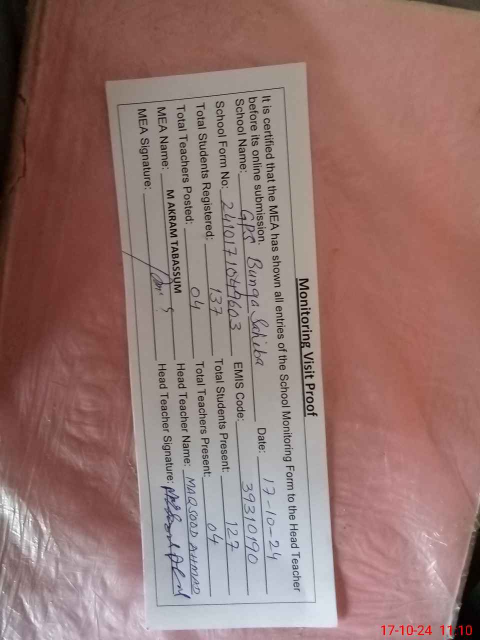 | EMIS Code: 39310190 | Name of School: GPS BUNGA SAHIBA | |||