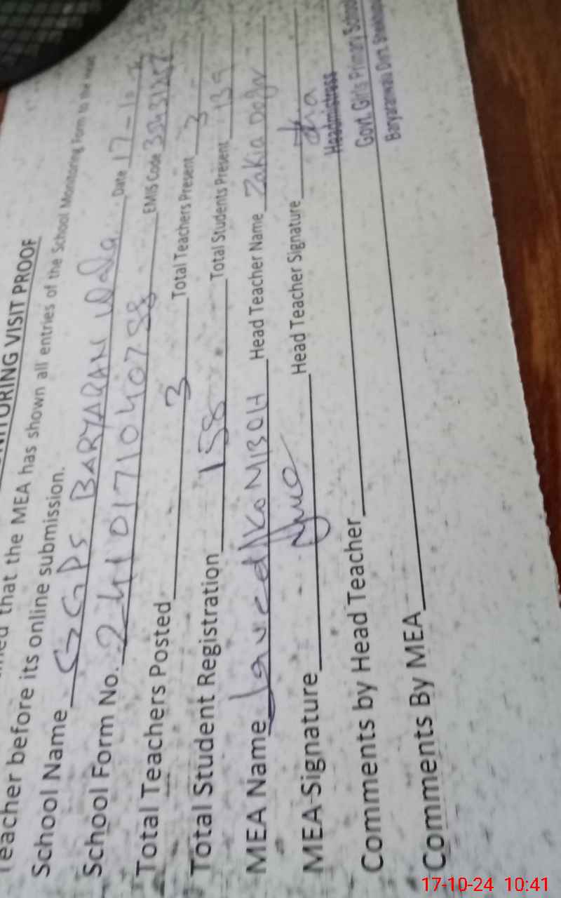 | Attendance Register | Head Teacher | MEA with School | Visit Proof |