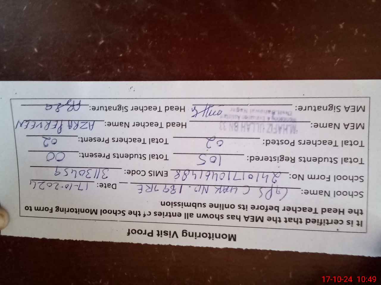 | Certified that this School was Inspected by the Undersigned MEA/DMO Today and the Information Stated Above is as Per Record. | |||||