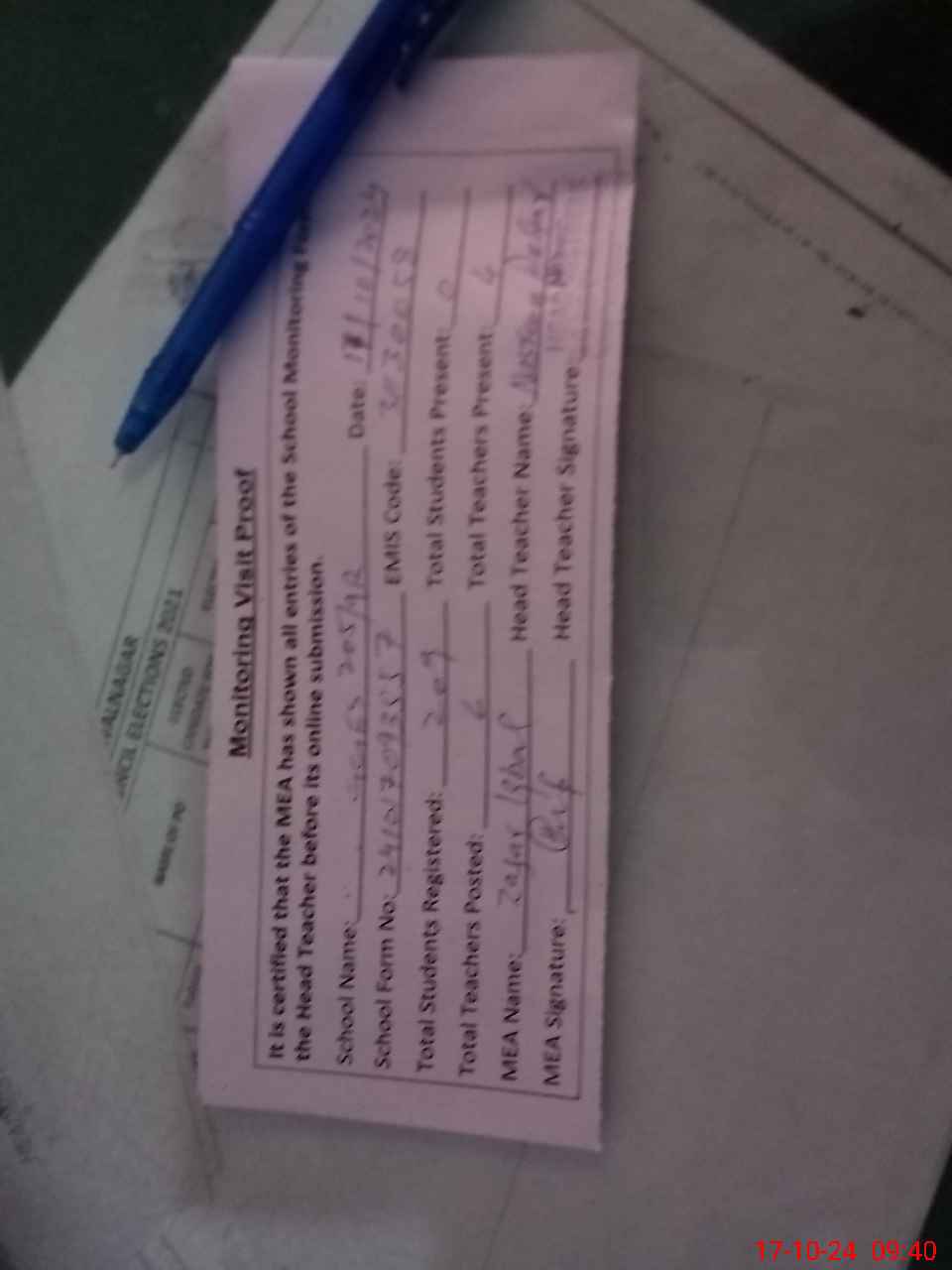 | Attendance Register | Head Teacher | MEA with School | Visit Proof |