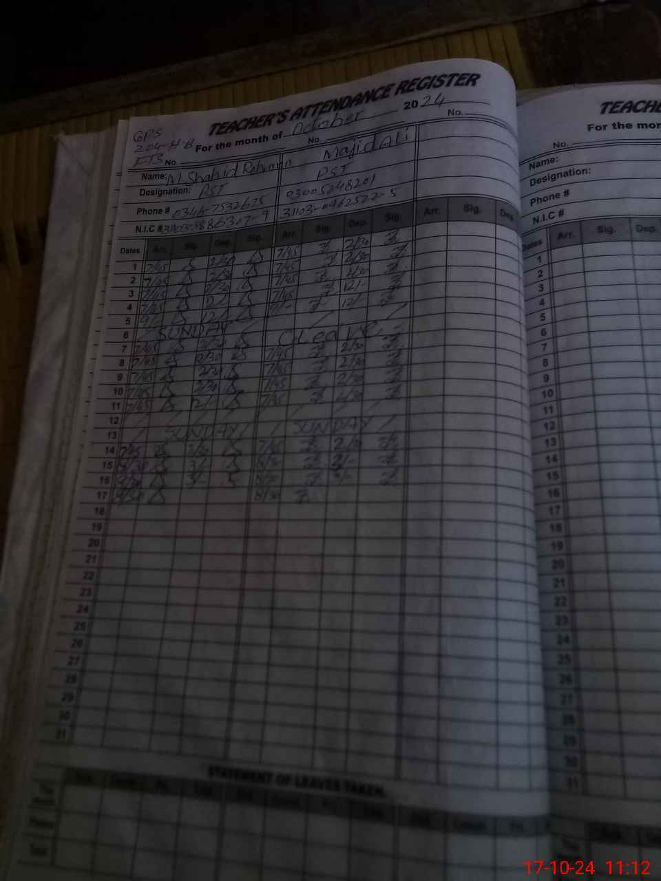| CNIC | Full Name | Designation | R/C | Absence During Last Calender Month |
