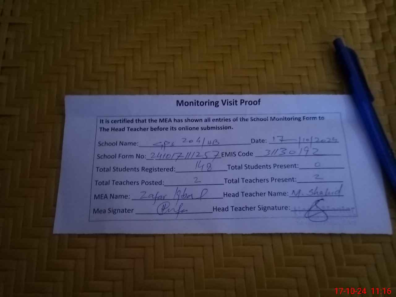 | Attendance Register | Head Teacher | MEA with School | Visit Proof |