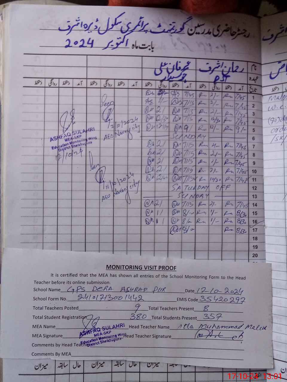| Attendance Register | Head Teacher | MEA with School | Visit Proof |