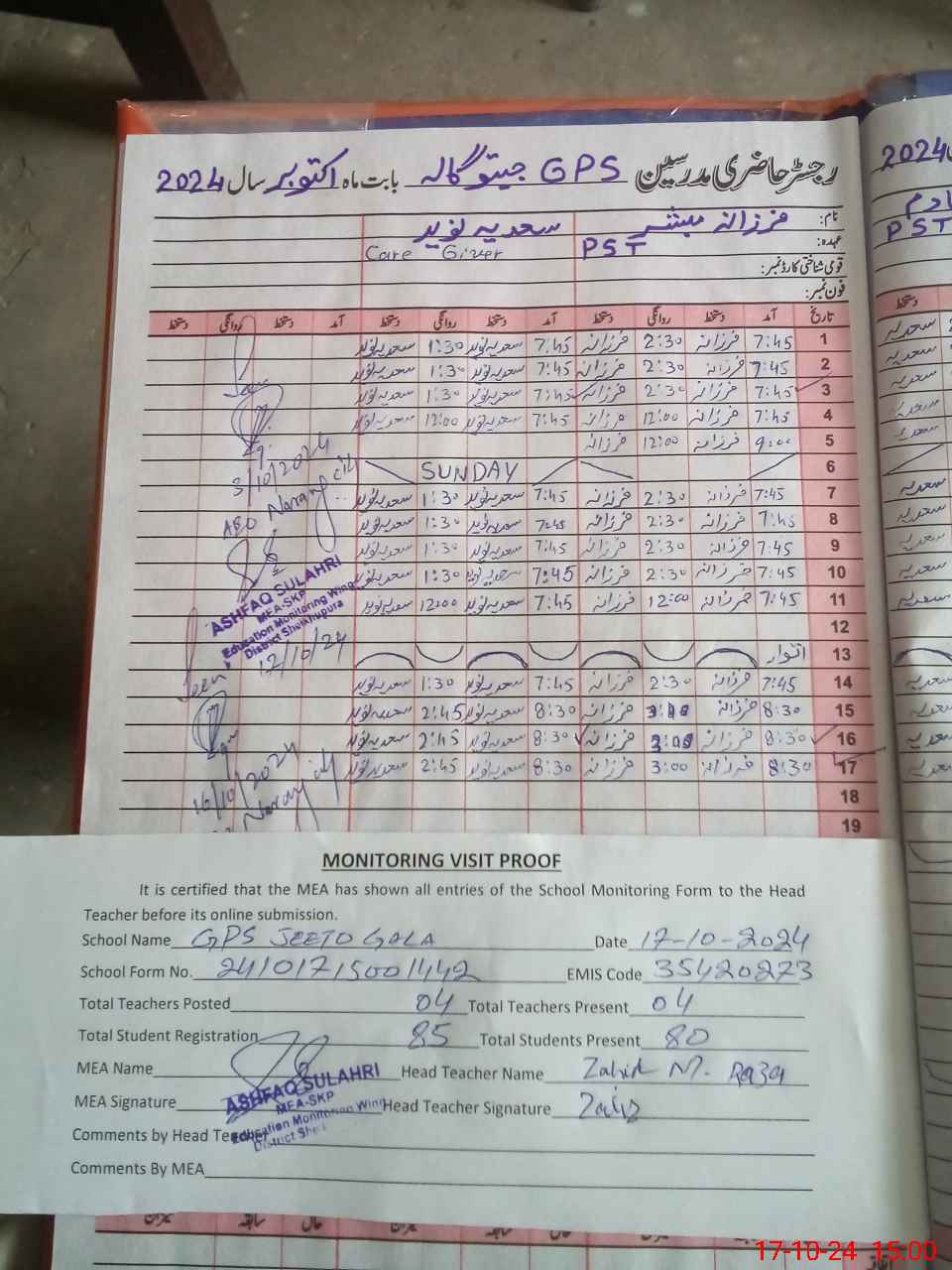 | Attendance Register | Head Teacher | MEA with School | Visit Proof |