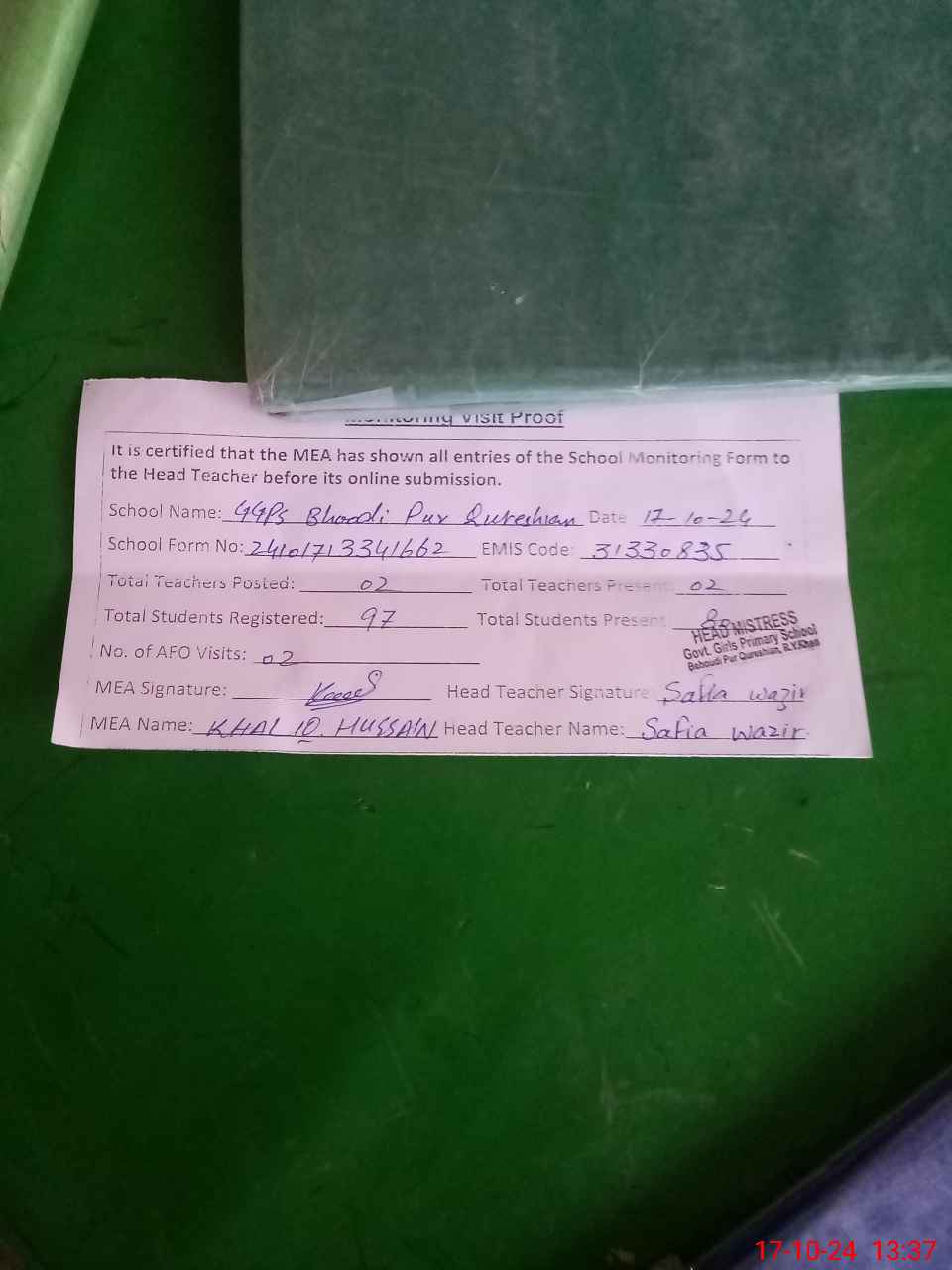 | Attendance Register | Head Teacher | MEA with School | Visit Proof |