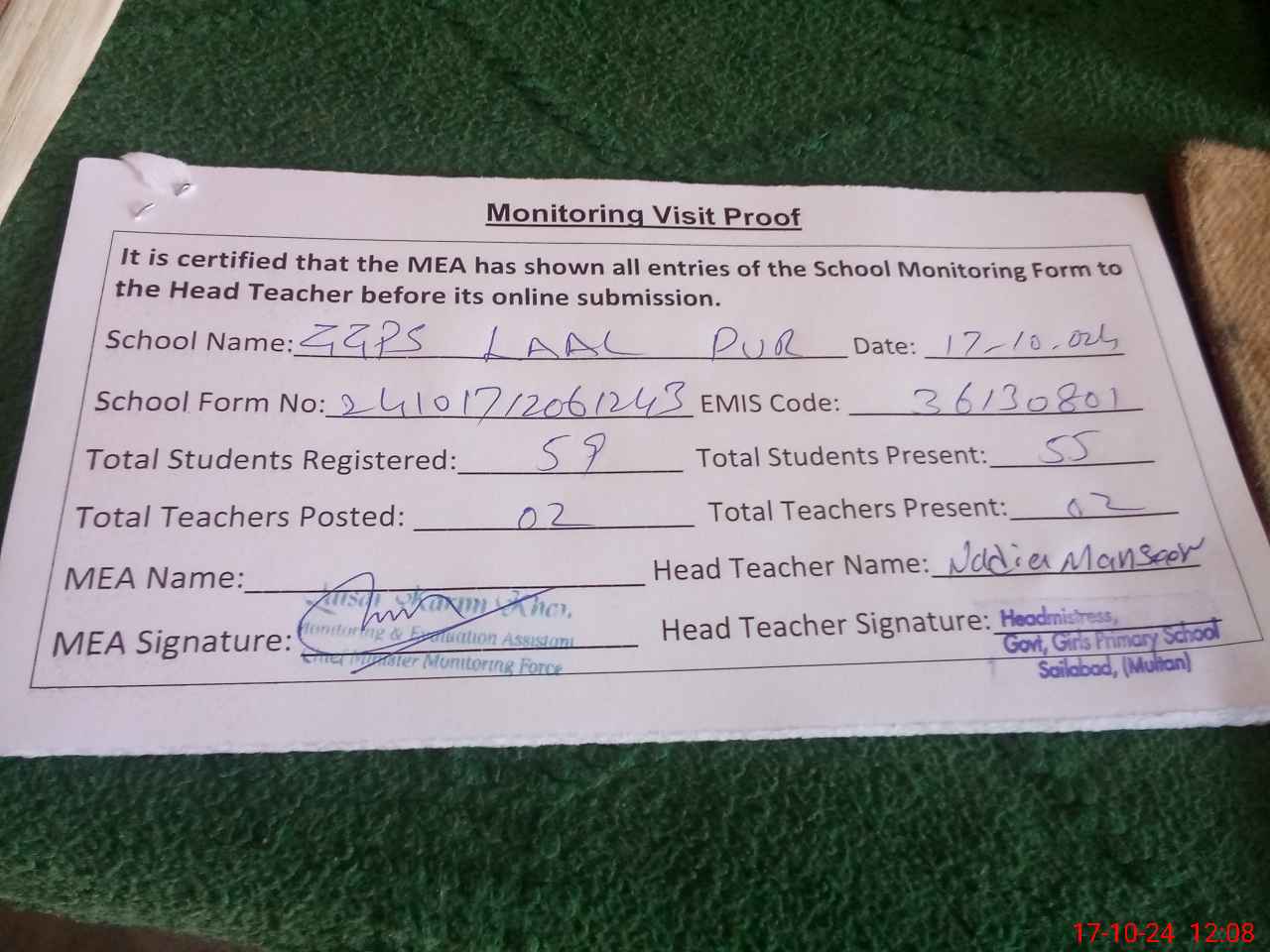 | Attendance Register | Head Teacher | MEA with School | Visit Proof |