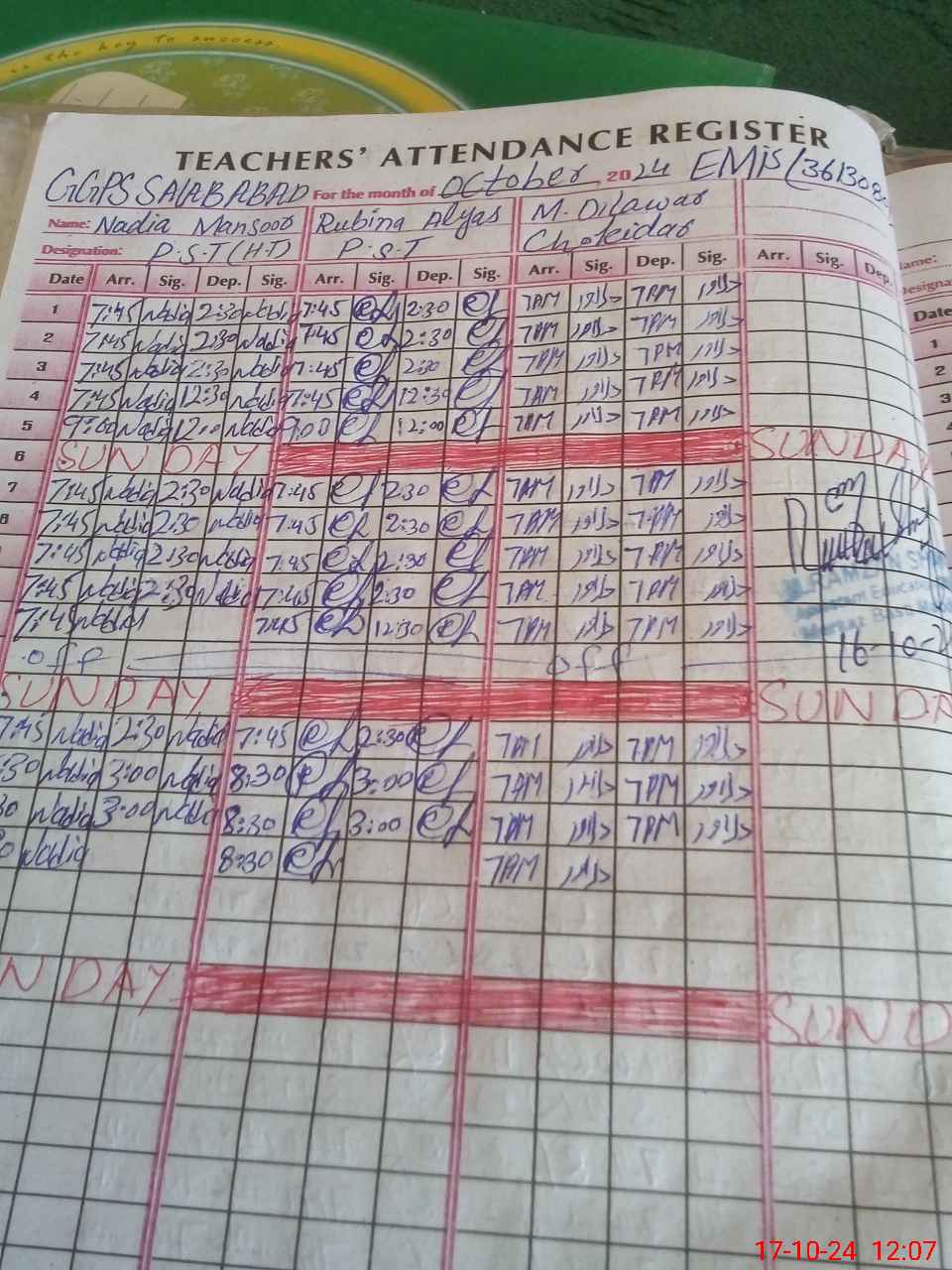 | CNIC | Full Name | Designation | R/C | Absence during last cal. month |
