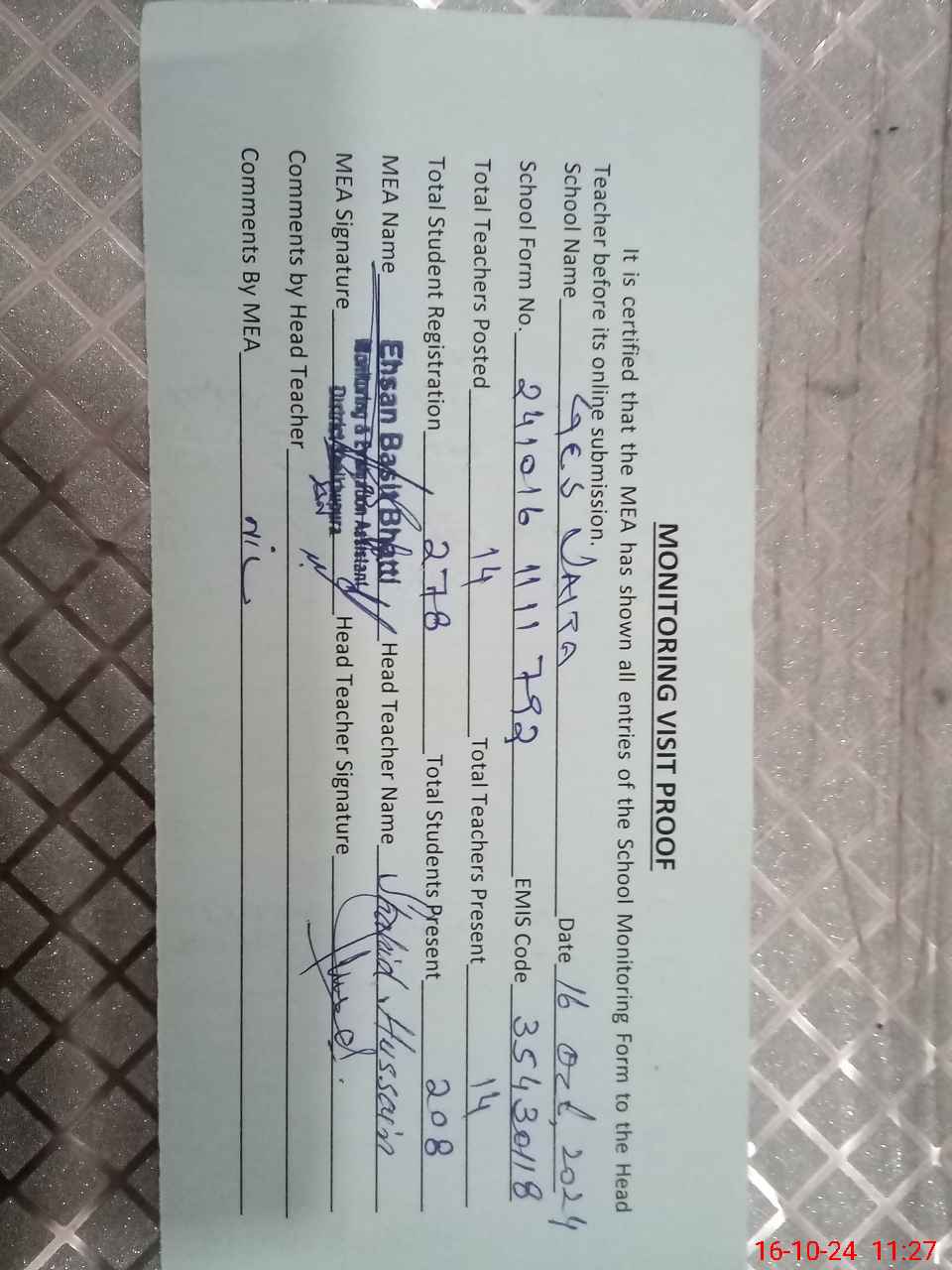 | Attendance Register | Head Teacher | MEA with School | Visit Proof |