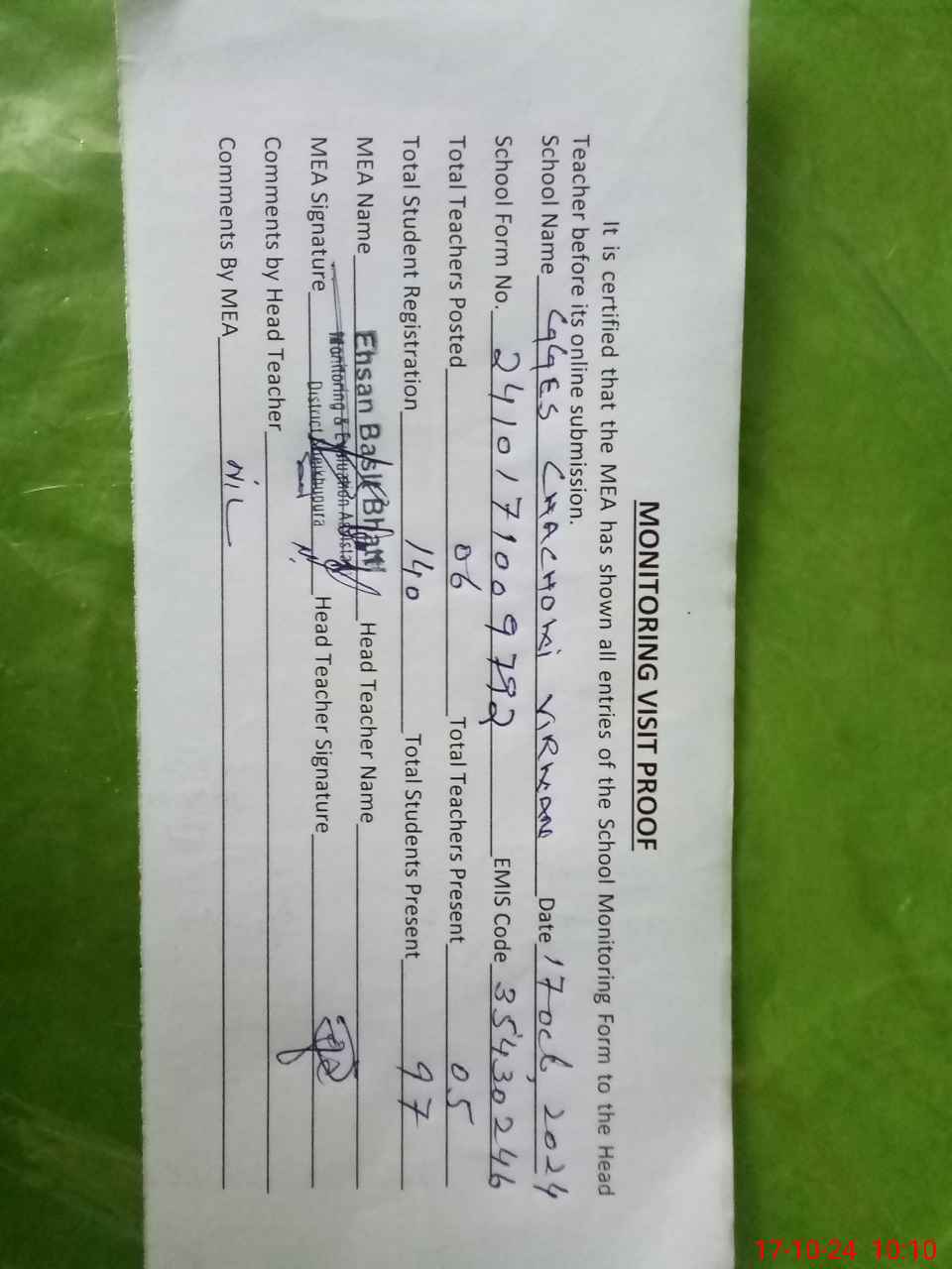 | Attendance Register | Head Teacher | MEA with School | Visit Proof |