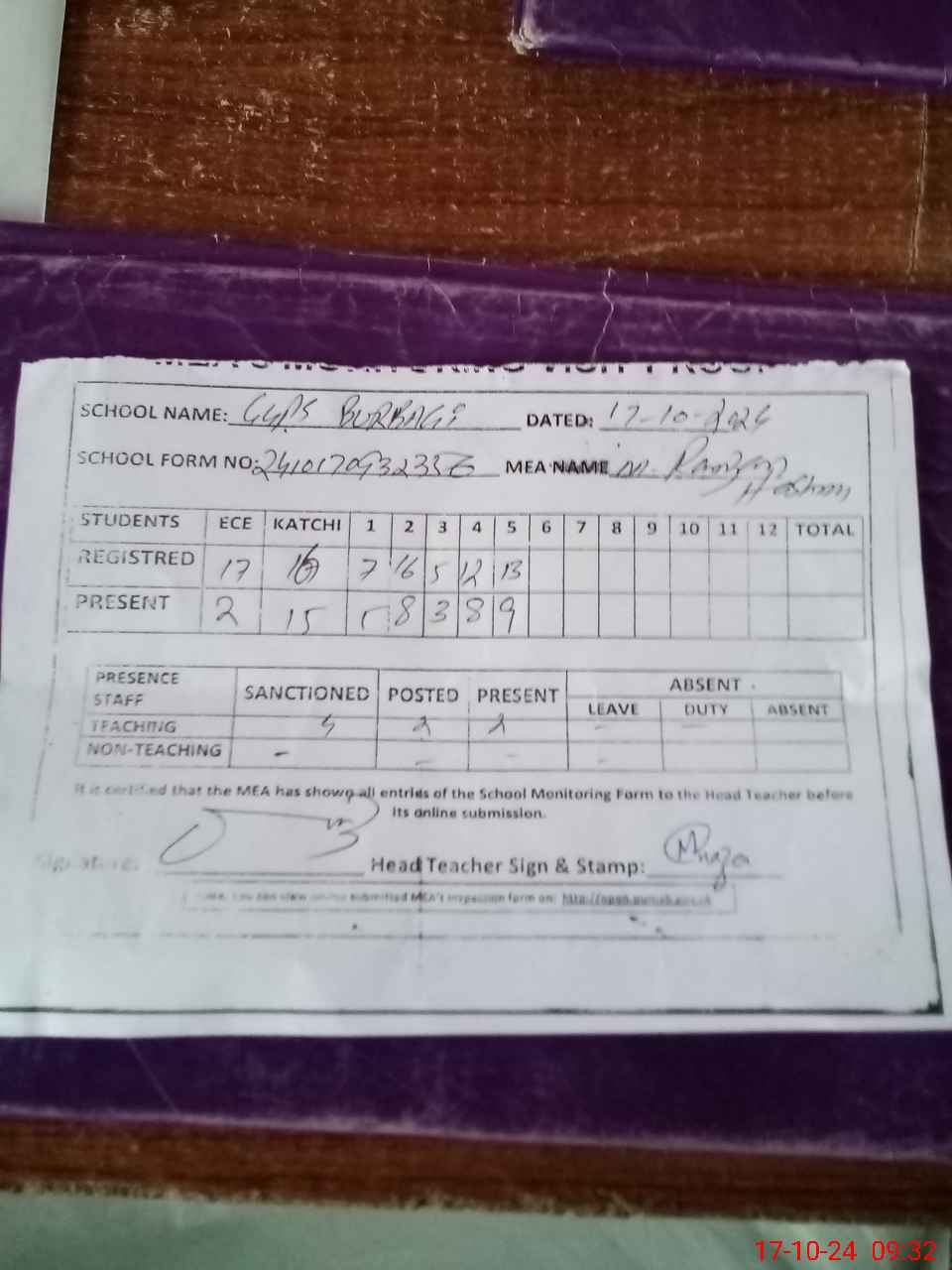 | Attendance Register | Head Teacher | MEA with School | Visit Proof |