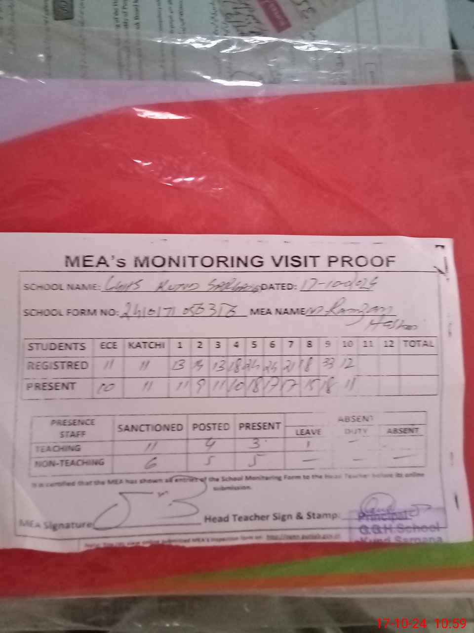 | Attendance Register | Head Teacher | MEA with School | Visit Proof |